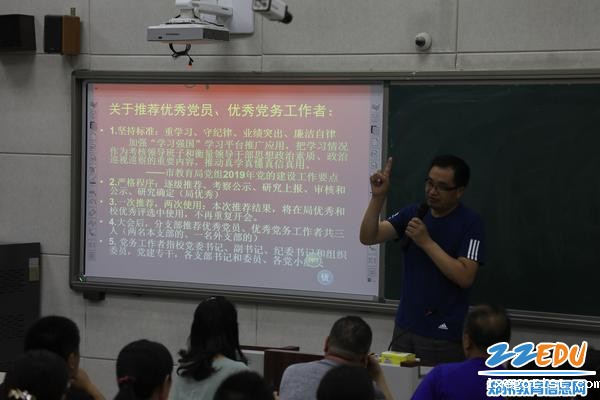 党委书记孙国岩针对教育局《关于做好推荐优秀党员、优秀党务工作者的通知》组织全体党员分支部进行民主评议工作