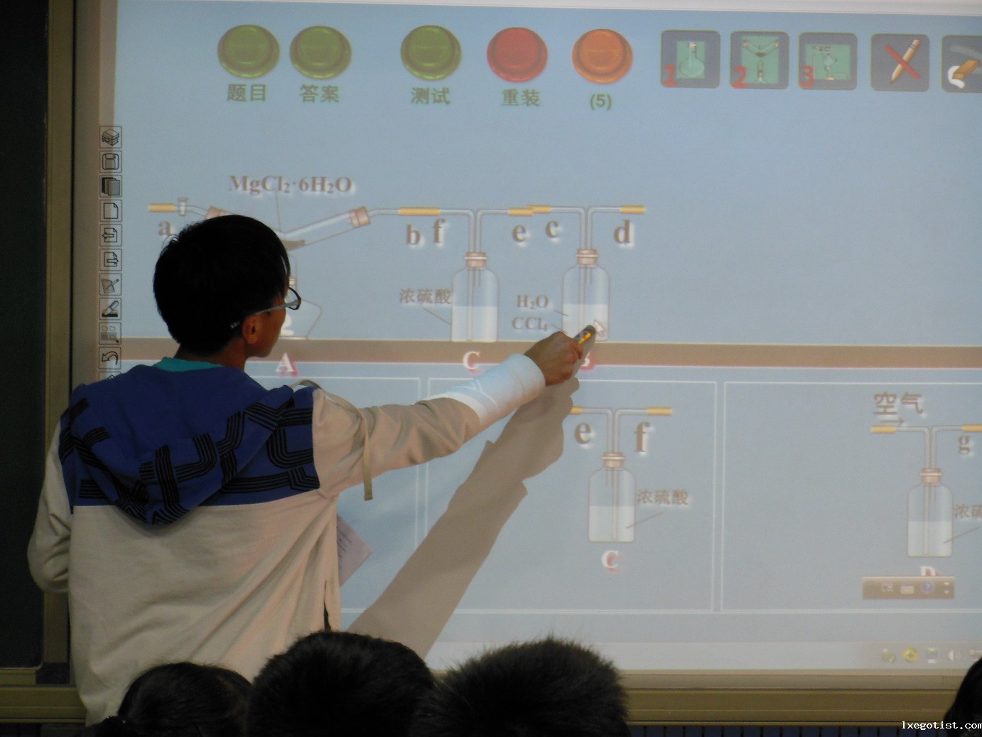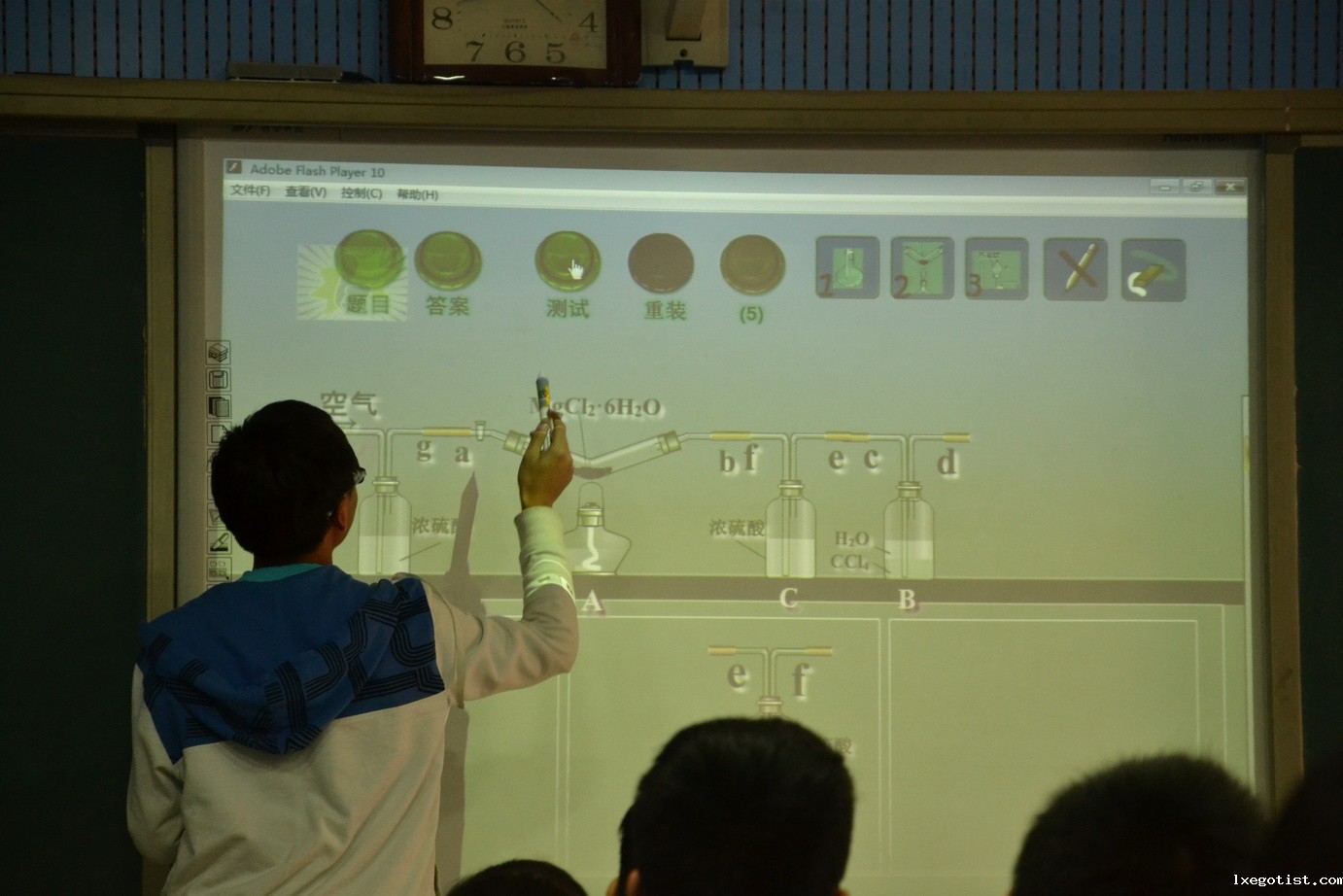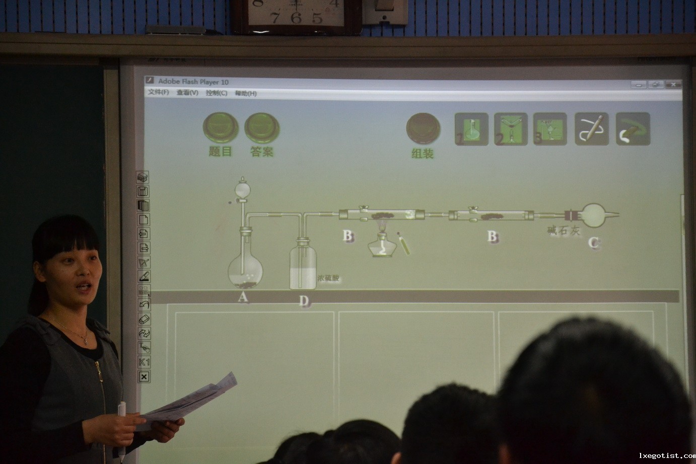 课题围绕电子白板上交互课件的使用,课题组成员共同探讨,设计方案,由甘强老师制作Flash交互课件,实现在课堂上模拟实验场景,选择、拖拽烧杯、集气瓶等实验仪器,连接组装成综合实验装置等操作。