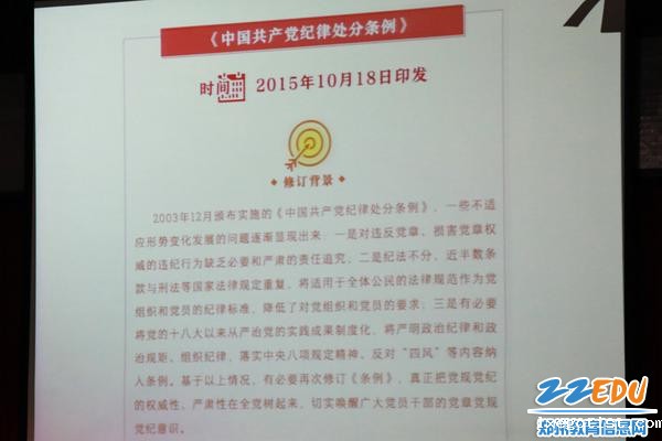 法安天下,德润人心,与会教职工认真聆听,纷纷表示在今后会进一步增强纪律意识、规矩意识,自觉遵守条例,提高个人修养,充分发挥纪律建设标本兼治的利器作用,使铁的纪律真正转化为党员干部的日常习惯。
