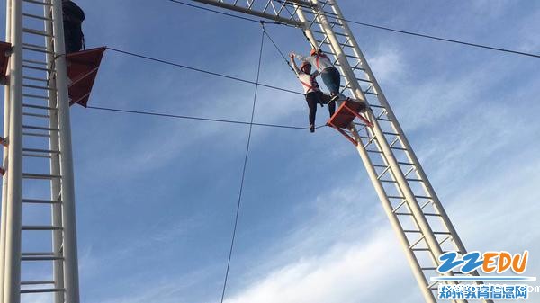 最具有挑战性的是“高空拓展”,训练了学生的勇气和心理素质,同学们相互鼓励,相互支持,这个活动让学生认识到只要战胜自己的恐惧心理,一切困难都会迎刃而解,增强了大家面对困难和挑战时的自我克服能力。老师们在同学们的感染下也参与了该项目,给同学们做起了表率!