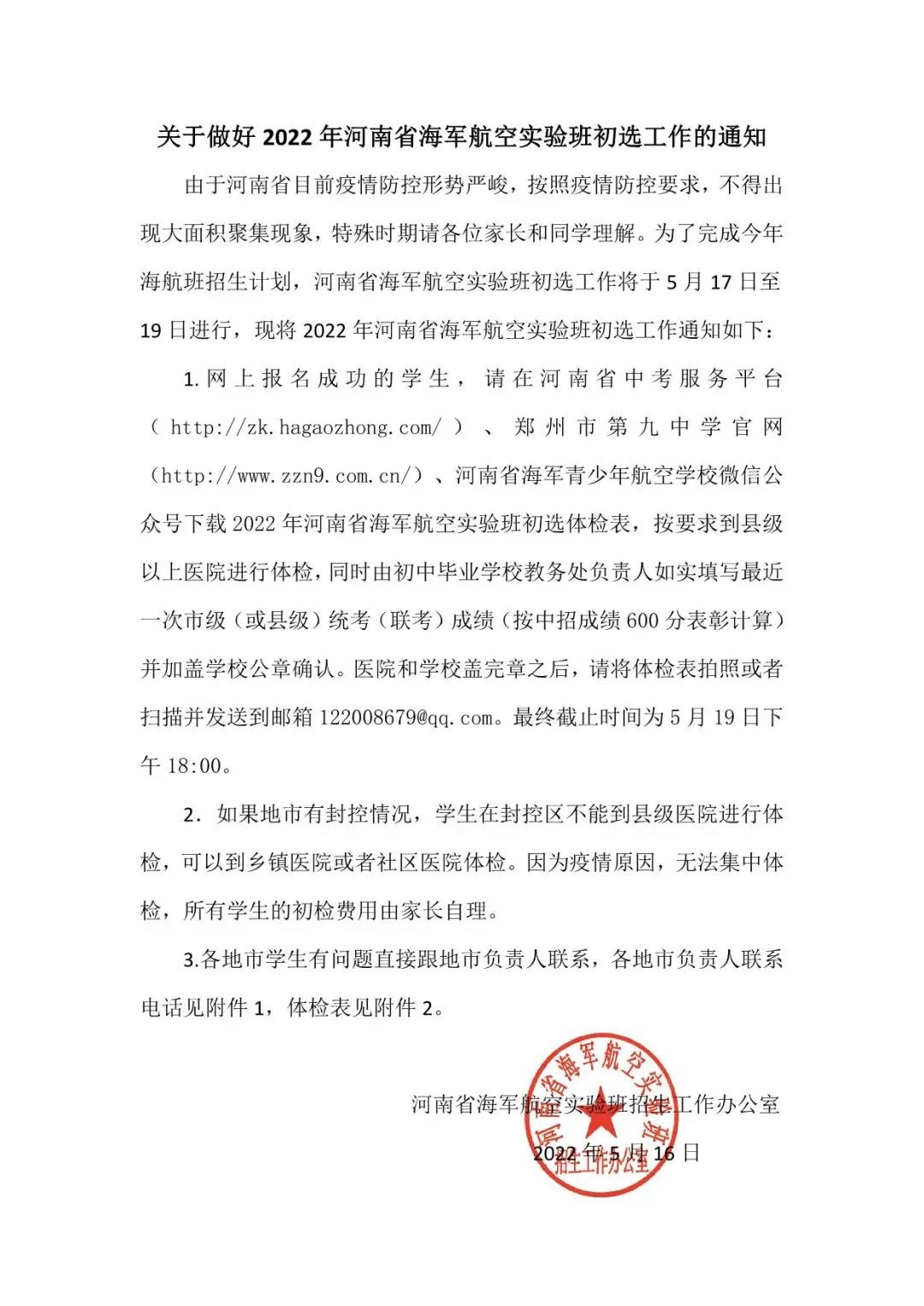 关于做好2022年河南省海军航空实验班初选工作通知!