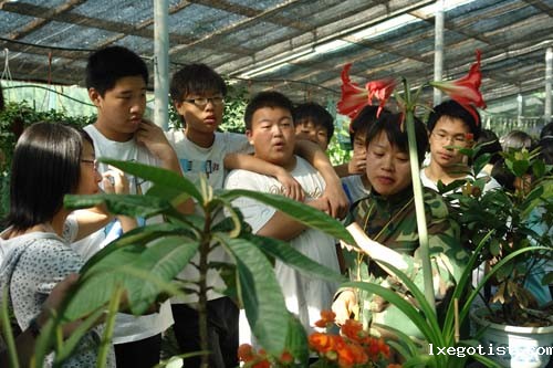 同学们在花房认识并了解各种花草植物
