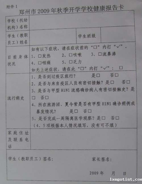 为做好预防甲型流感第一课,学校要求校医要认真收集整理有关甲流的学习材料并印发给学生人手一份。各班主任、处室主任必须在开学一周内做好暑期学生、教师外出情况摸底工作,并认真填写郑州市2009年秋季开学学校健康报告卡。年级长、中层干部要对非班主任和处室工作人员进行培训,使其掌握甲型H1N1流感及防控的相关知识,并通过班会让每一个学生认真学习。各班要做好学生每天的晨检工作,填写晨检表,于每天下午4:30以前交到政教处,政教处整理后于5:00以前上交市教育局。对于缺课的学生要追查其未到校的原因,特别要调查其是否有甲型流感的相似症状。严防外来人员进校。外来车辆(除了上级主管部门事先联系好的车辆外)一律不得入内。家长联系不到班主任不得入内。食堂工作人员不得随意出入校园。一旦发现有甲流症状的任何情况,班主任和处室主任必须第一时间上报校长和校医,学校必须及时把有关情况上报市教育局。