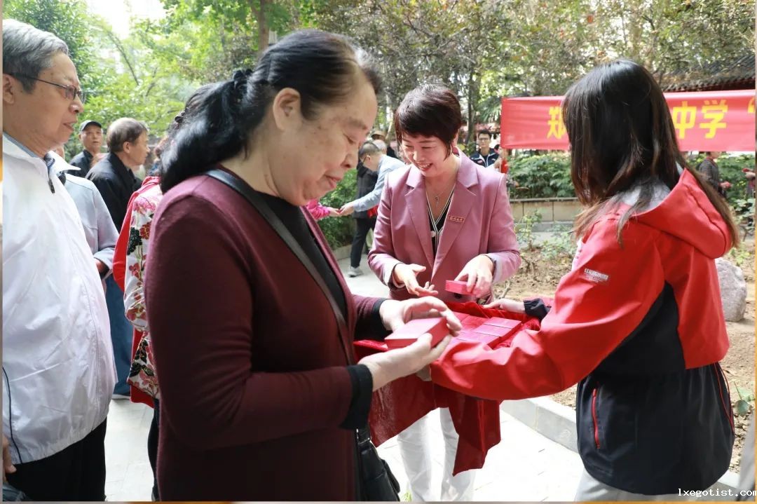 校长张莹和纪委书记江炜为老三届校友赠送纪念校徽