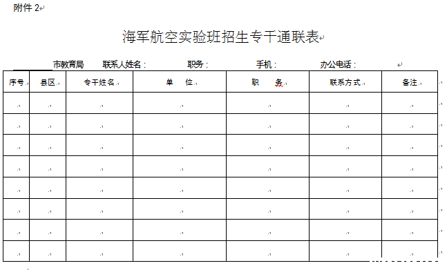 (一)提高认识,加强领导。举办海军航空实验班,是着眼于海军转型建设和高素质飞行人才培养需要,顺应推进军民融合和地方普通高中多样化改革方向遵循飞行人才成长规律,从源头上提高军队飞行学员选拔质量的有效举措,对于加强国防建设,建设强大的海军具有重要的战略意义。各级教育行政部门要切实加强领导,将其作为一项政治任务,摆上重要议事日程,认真安排部署。海军航空实验班招生工作时间紧、任务中、要求高,涉及多个部门和单位,涵盖宣传动员、政治审核、体格检查、心品测试、选拔录取等多个环节,各地要明确一名海军招飞专干配合海军招飞机构做好海军航空实验班招生中的各项工作,并认真填写上报《海军航空实验班招生专干通联表》(附件2)。各初中学校校长要亲自负责,协助有关部门做好考生报名、考查筛选等工作。省教育厅将会同海军招飞办对工作负责、成绩突出的单位和个人进行表彰。